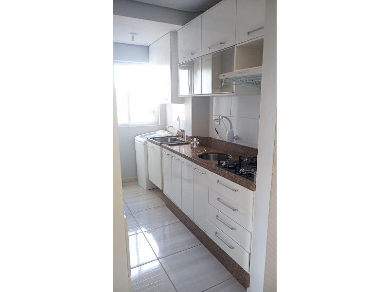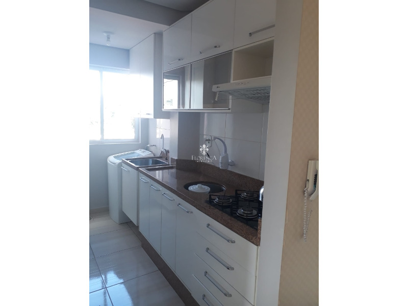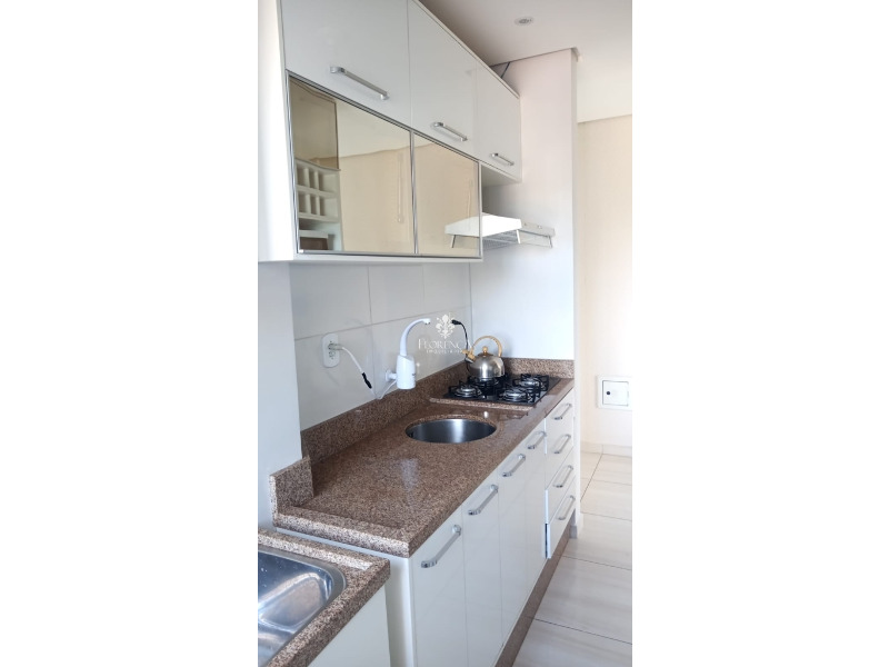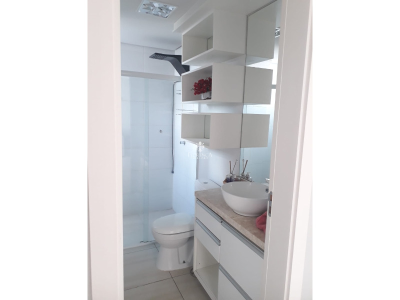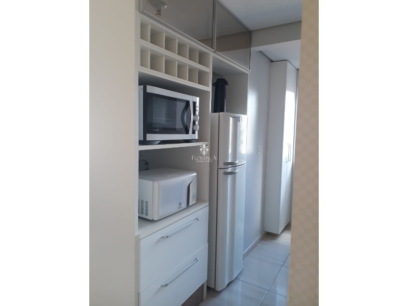 Dispõe de dois dormitórios, um banheiro social, sala, cozinha com móveis planejados, cooktop, geladeira e fornos, área de serviço com armarios planejados e máquina de lavar, sacada fechada, com churrasqueira, e uma vaga de garagem coberta.