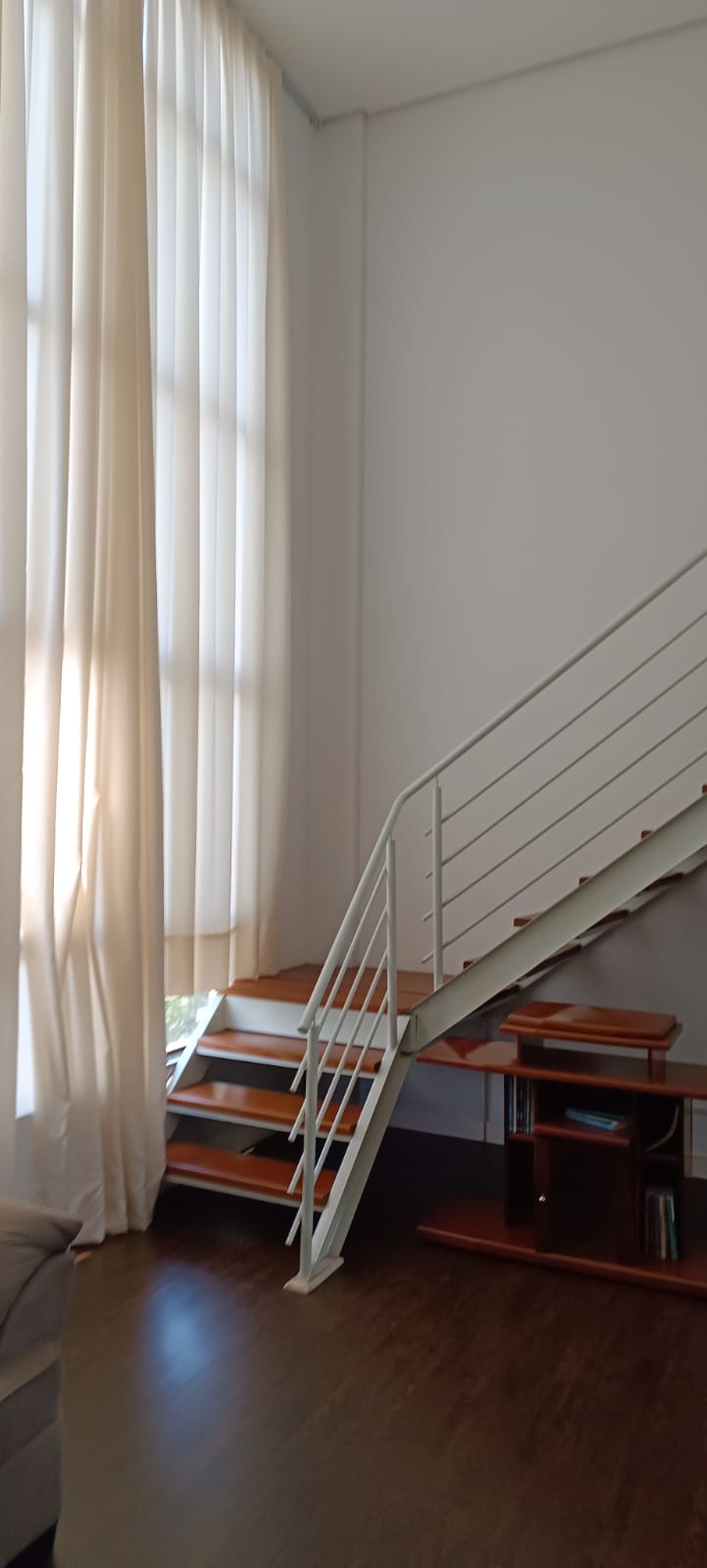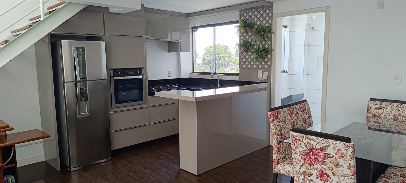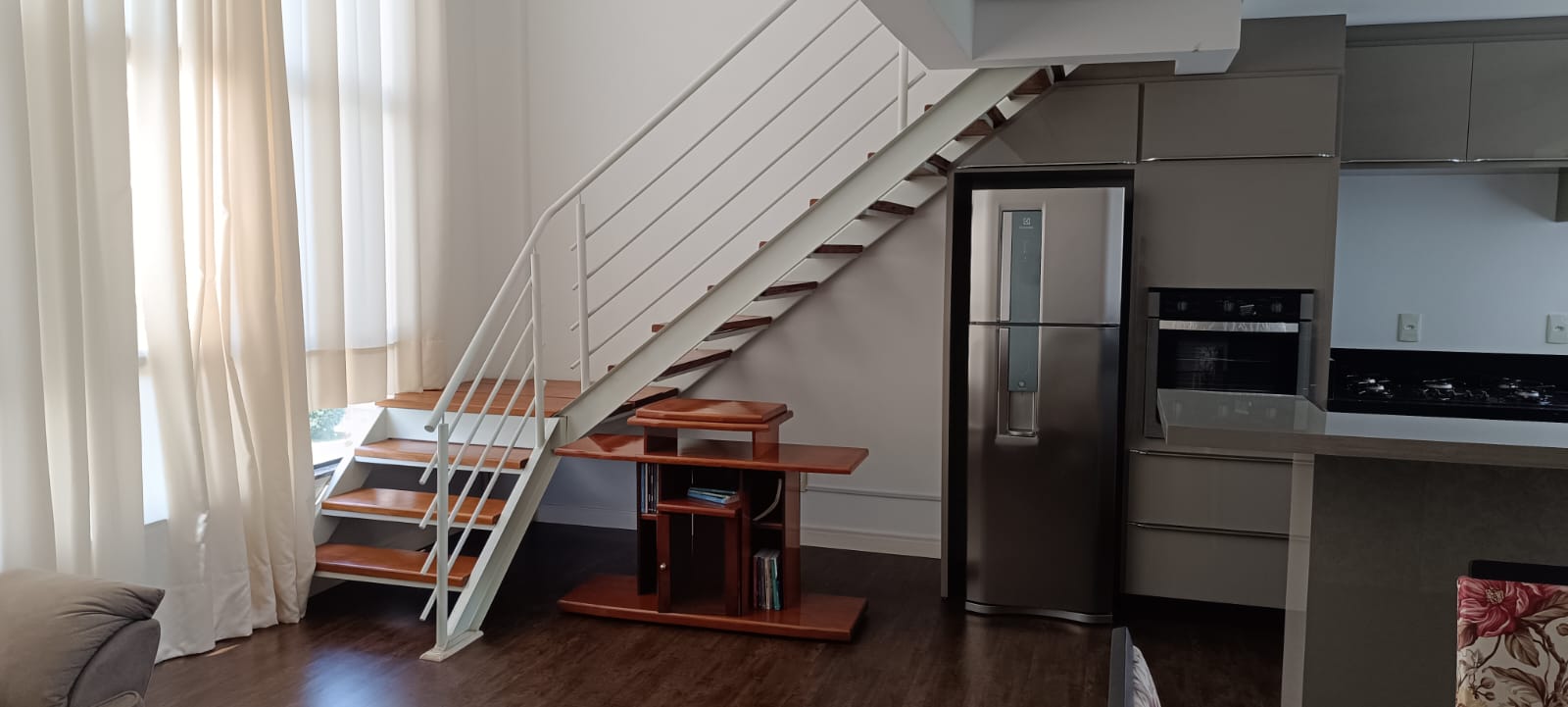 Loft que dispõe de uma suíte na parte superior; sala, cozinha e banheiro social na parte inferior, e uma vaga de garagem coberta.