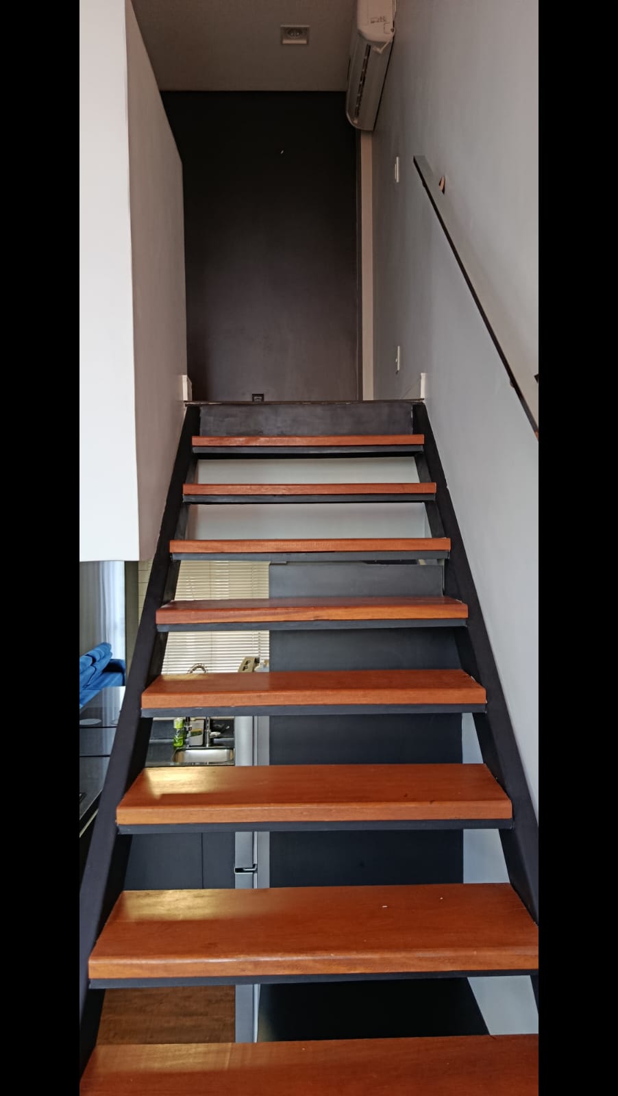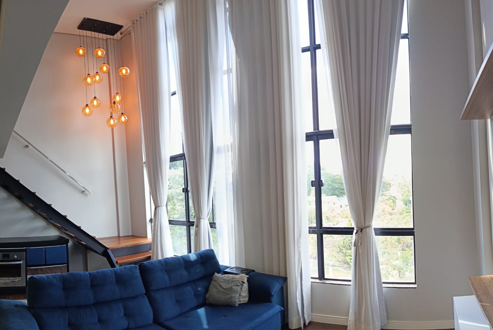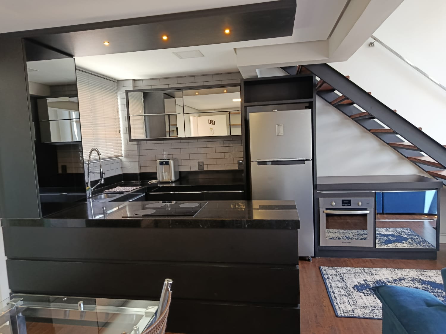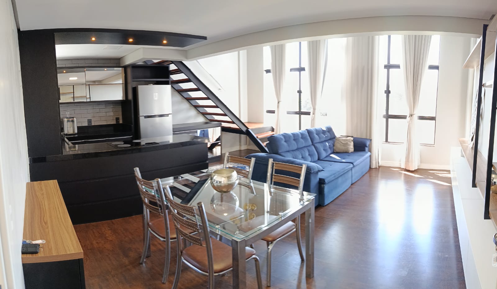 Loft que dispõe de uma suíte na parte superior; sala, cozinha e banheiro social na parte inferior, e uma vaga de garagem coberta.