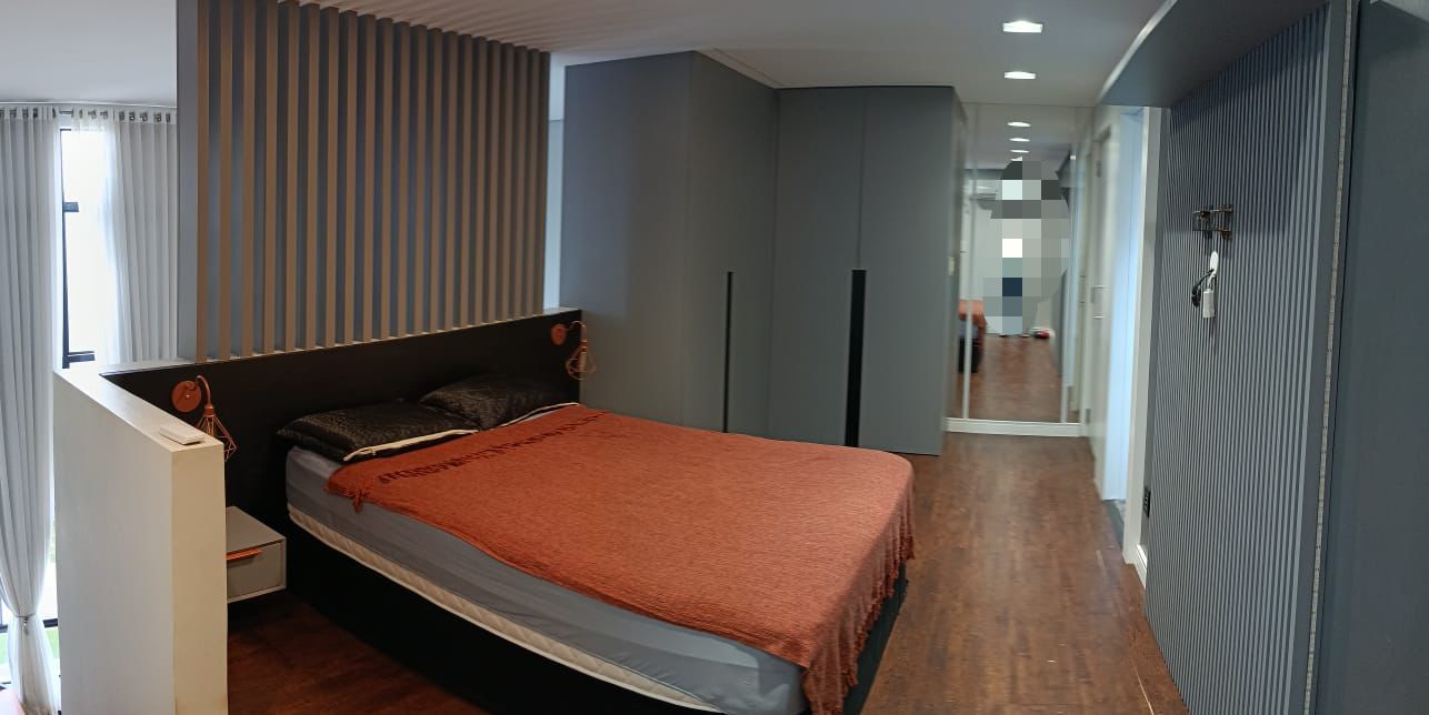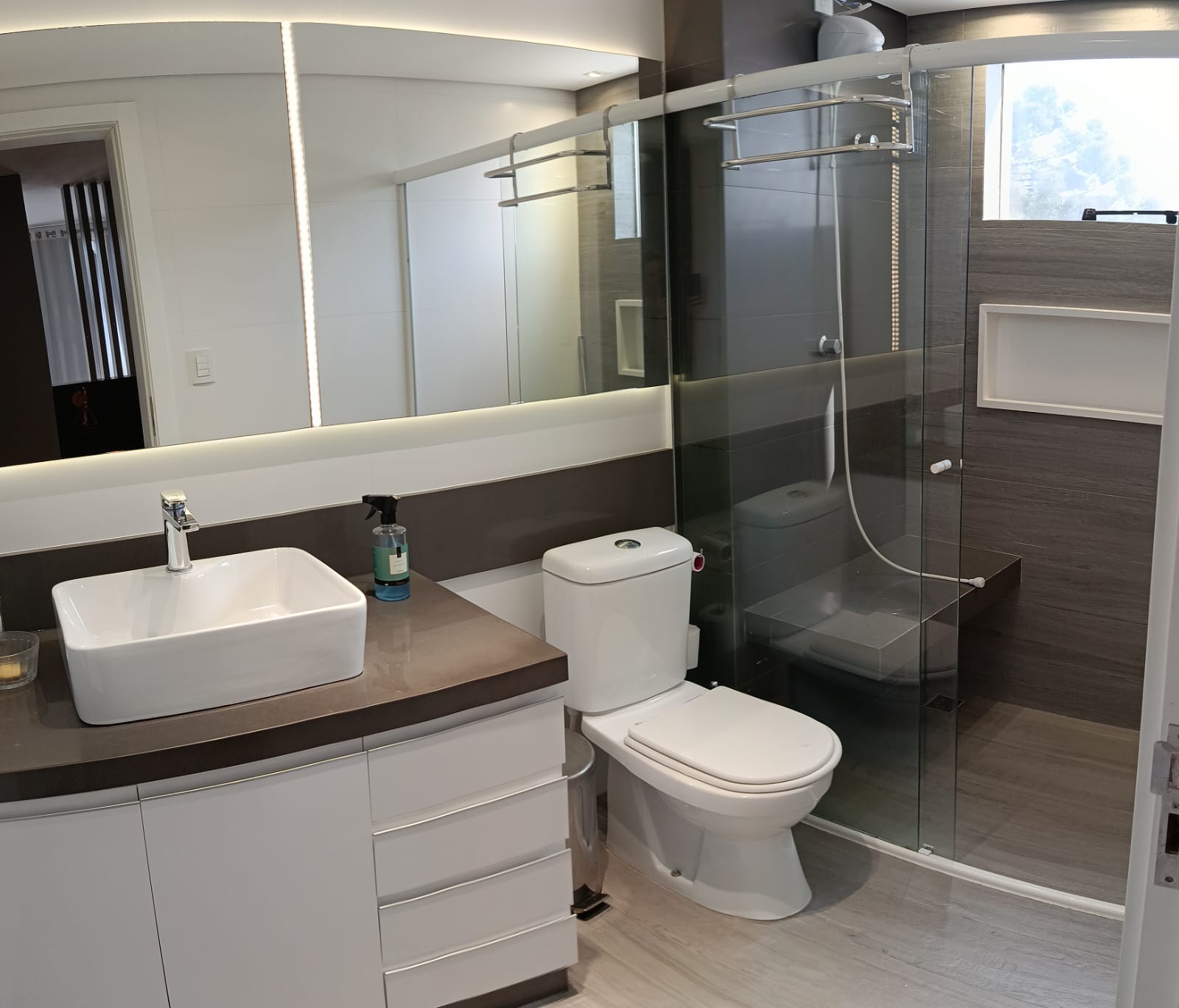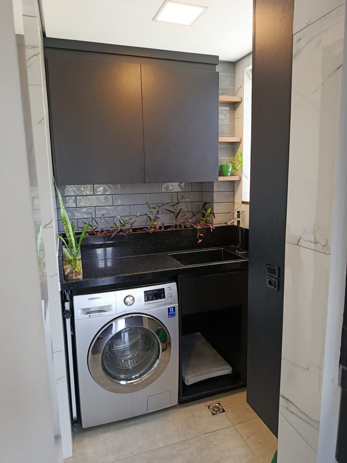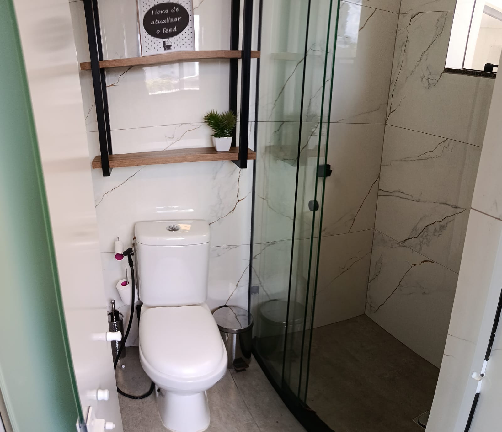 Loft que dispõe de uma suíte na parte superior; sala, cozinha e banheiro social na parte inferior, e uma vaga de garagem coberta.